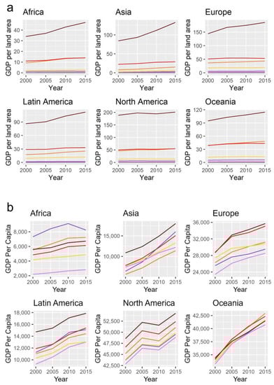GDP growth in each human settlement from 2000 to 2015. (a) GDP per land area (USD/square meter) in each human settlement from 2000 to 2015. (b) GDP per capita (USD per capita) in each human settlement from 2000 to 2015. Legend is the same as Figure 5c,d.