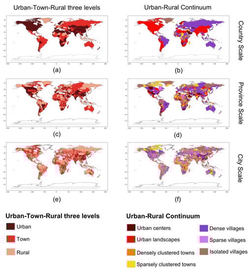 This concept, which emphasizes the continuous transitional landscapes between urban and rural areas, is called the rural–urban continuum. Since the early 20th century, the theory of a rural–urban continuum has been continuously enriched, developed, and matured in practice [,,,,,]. In 1970, the United States Department of Agriculture began to develop the Rural–Urban Continuum Code (RUCC) to classify counties []. Similarly, landscape features of the rural–urban continuum have been noted in several regions of the globe, including Europe [,], China [,], and India []. In Europe, much of physical territory is regarded as areas between urban and rural, and there have been proposed definitions and mapping criteria for these peri-urban areas [,]. In addition, the traditional Chinese settlement system has been seen as a town–village–field continuum []. There are studies that have defined the settlement system in China and mapped its change trajectory between 1990 and 2010 []. However, the criteria and thresholds for dividing urban and rural areas vary widely in each country and region. Empirical analysis and conceptual comparisons show that towns and cities are likely to be classified as rural areas in Africa and Asia, and as urban areas in other parts of the world []. Therefore, it is necessary to construct a unified classification system on a global scale to define and map the various types of areas in the rural–urban continuum. Globally, the Global Human Settlement Layer (GHSL) produced by the Joint Research Centre (JRC) of the European Commission has provided mapping results at 5-year intervals beginning in 1975 and predicts changes over the next decade [].