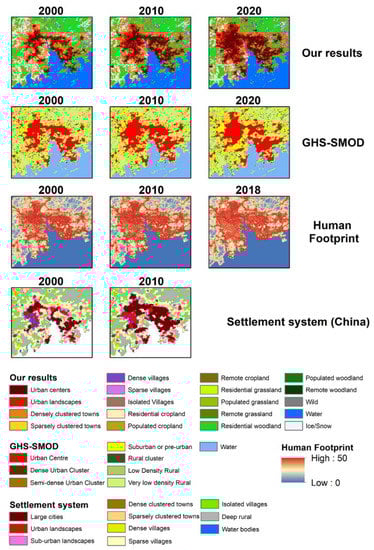 The criteria and thresholds for the division of urban and rural areas have always been difficult to determine and are different across countries worldwide. Therefore, it is very meaningful to propose a classification system of the global rural–urban continuum and produce the mapping result, so that we can compare the differences in the urbanization process on a global scale. Inevitably, some local specificities have been overlooked in this global effort. So, we compared the spatial distribution of our data products with other similar human settlement mapping products (Figure 11). Although different classification systems are not completely the same, it can be seen from the results that the data products in this study have a strong consistency with other data products in spatial distribution, which can reflect the continuous changes in urban expansion in a long time series. In addition, it also provides finer details of the urbanization progress in the rural–urban continuum.