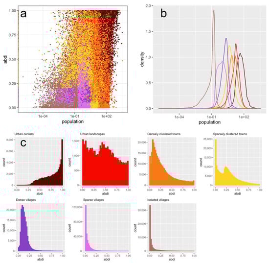 Population density and built-up density (ABDI, Adjusted Built-up Density Index) of human settlements samples in the rural–urban continuum. (a) Scatter plot of ABDI against the population density. (b) Distribution of population density in the rural–urban continuum. (c) Sample counts of different ABDI levels in the rural–urban continuum.