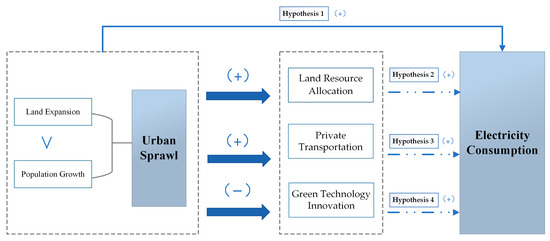 The impact of urban sprawl on electricity consumption can be categorized into two dimensions: production and living. Firstly, urban sprawl affects the way land resources are allocated, bringing about a shift in production activities and an adjustment of the industrial structure, while there are obvious differences in the electricity demand of different industries. At the present stage, government intervention and determination of spatial allocation of land resources are still relatively common. In pursuit of economic construction, local governments restrictively provide residential land, provide more industrial land, and create industrial parks to track economic growth targets. The allocation of land resources in favor of large-scale industrial land grants has led to the relocation of energy-consuming and low-end industries, restricting the development of the service sector and the supply of service products, and hindering the improvement of energy resource efficiency. Urban sprawl is inherently characterized by inefficient land resource allocation, and crude production patterns contribute to the increase in industrial electricity consumption. Secondly, urban sprawl leads to low-density expansion, resulting in urban spatial disorder, which makes residents more demanding in terms of mobility and so on. Urban sprawl increases residents’ transportation demand, and the supply of public transportation is difficult to meet residents’ emergent requirements in a short period of time, leading to a rapid increase in private car ownership. Urban sprawl increases the number of cars in the city and also increases electricity consumption. Finally, excessive urban sprawl is not conducive to the formation of agglomeration effects and inhibits green technological innovation. Technological innovation has obvious spatial agglomeration characteristics. Sharing, matching, and learning mechanisms are important for the diffusion and spillover of innovative knowledge [77]. The urban spatial structure with over-expansion of land weakens knowledge learning and technology spillover among firms, leading to inertia in industrial green transformation and thus adversely affecting energy-efficient production. In summary, the hypothesis was proposed as follows. The theoretical mechanism analysis diagram is shown in Figure 1.