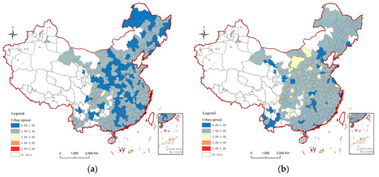 Spatial-temporal evolution at the urban sprawl level. (a) 2009; (b) 2019. Note: Produced based on the standard map with review number GS (2019) 1822 on the Ministry of Natural Resources of the People’s Republic of China Standard Map Service website (http://bzdt.ch.mnr.gov.cn/ (accessed on 1 June 2023)), with no changes to the base map boundary.