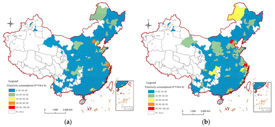 Spatial-temporal evolution of electricity consumption. (a) 2009; (b) 2019. Note: Produced based on the standard map with review number GS (2019) 1822 on the Ministry of Natural Resources of the People’s Republic of China Standard Map Service website (http://bzdt.ch.mnr.gov.cn/ (accessed on 1 June 2023)), with no changes to the base map boundary.