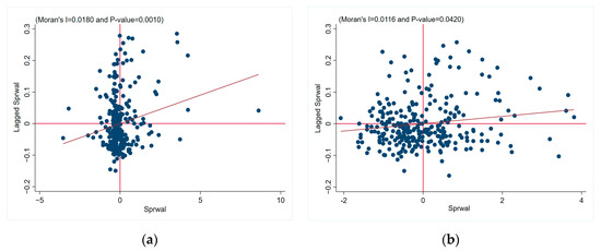 The Local Moran’s I index scatter plot can well characterize the spatial agglomeration of urban sprawl (electricity consumption), and the Local Moran’s I measurement is shown in Equation (3).