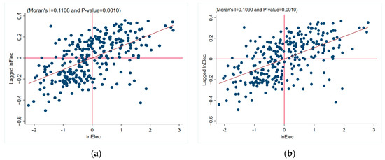 Where is the sample size, and are the urban sprawl index (electricity consumption) in city and city, respectively, and is the mean value. Global Moran’s I is in the range of [−1, 1]. When Global Moran’s I > 0, it means the spatial distribution is positively correlated. Conversely, when Global Moran’s I < 0, it means that the spatial distribution is negatively correlated. And, when Global Moran’s I = 0, it means that there is no spatial correlation [87]. is the inverse distance spatial weight matrix.