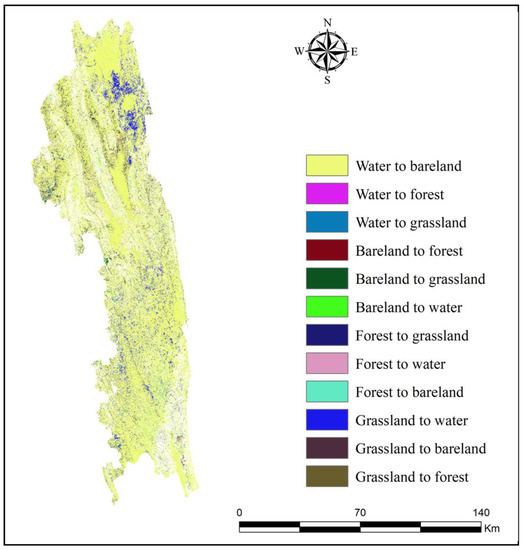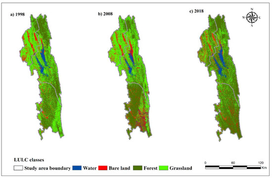 The post-classification comparison of LULC change for each class within the study period from 1998 to 2018 is shown in Figure 5, whereas the result analysis of LULC change is indicated in Table 5. From 1998 to 2008, only bare land increased by 665.04 Km2. In contrast, water, forest, and grassland decreased significantly by −30.40 Km2, −528.04 Km2, and −106.60 Km2, respectively, with a significant decrease in bare land and grassland, i.e., −692.07 Km2 and −2614.17 Km2, between 2008 and 2018 (Table 5). During the three decades, the grassland decreased by −2720.77 Km2, while the forest increased by an area of about 2708.36 Km2.