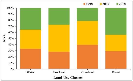 Land use cover changes (LULCCs) were computed for 1998, 2008, and 2018, focusing on vegetation, grassland, water bodies, and the bare land area in the study area (Figure 3). In 1998, the maximum land area covered by grassland accounted for 44.71% (5901.11 Km2), which gradually decreased to 43.90% (5794.51 Km2) in 2008 and 24.10% (3180.34 Km2) in 2018. Whereas the forest area was calculated to be approximately (5576.26 Km2) in 1998, 5048.22 Km2 (2008), and 8284.62 Km2 (2018), with a slight decrease of −4% from 1998 to 2008 and periodic increments of 24.52% from 2008 to 2018. The bare land area was calculated to be 1188.75 Km2 in 1998, 1853.79 Km2 in 2008, and 1161.72 Km2 in 2018, with an increase of 5.04% from 1998 to 2008 and then a decrease of −5.25% from 2008 to 2018 (Table 3). The cumulative change calculated in water area was approximately 39.44 Km2 (1998–2018), 532.04 Km2 in 1998, and 571.48 Km2 in 2018. An increase of 0.3% was observed in water from 1998 to 2018 (Table 3, Figure 4).