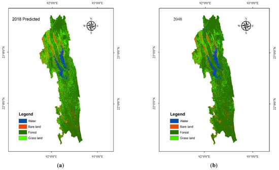 Predicted LULC classification maps of Chittagong Hill Tracts (a) predicted map of 2018 and (b) predicted map of 2048.