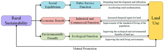 Previous studies have examined various aspects of rural sustainability and land use. For example, Ma et al. [33] investigated the relationship between land use structure and functionality, focusing on the demand for residential land functionality in achieving rural sustainability. By establishing an indicator system, the rural residential land use function was evaluated from the perspective of supply and demand. Li et al. [34] explored and summarized the evolutionary path and development patterns of rural settlement spatial structures in the southern region of China, considering the rural revitalization strategy. Yang et al. [35] established an evaluation index system for the production–living–ecological functions of villages in the Beijing–Tianjin–Hebei region and evaluated the production–living–ecological functions of villages in the Beijing–Tianjin–Hebei region, which provided a reference for decision-making in realizing the goal of sustainable development of villages. Statuto et al. [36] utilized geographic information systems to investigate mountainous regions in southern Italy and Montenegro. They analyzed the value of rural tourism development and vernacular farm building construction, offering tools and recommendations for promoting local, sustainable development. However, the existing literature reviews on rural sustainability and land use have primarily focused on specific countries or regions, lacking a global perspective. Moreover, these studies have predominantly addressed specific aspects, failing to provide a comprehensive overview of the field’s current state or future directions. This limitation restricts researchers’ capacity to examine rural sustainability and land use from diverse perspectives. What is the connection between land use and sustainable rural development? How can declining rural areas be revitalized? How can we achieve more sustainable development while increasing land productivity? How can rural structural adjustments be implemented to promote rural transformation and development? To address and answer these questions, a comprehensive and systematic review and analysis of research in this field is necessary. The research in this paper will be based on the scientific assumption that rural sustainability brings direct or indirect impacts on social, economic, and environmental aspects, which can change the functioning of the land and consequently affect land use. Conversely, land use can also, through that pathway, counteract rural sustainability (Figure 1). The relationship between the two is one of interaction.