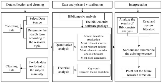 In this study, the bibliometric methodology was employed through a comprehensive exploration of the Web of Science Core Collection database. This database stands as a globally esteemed and expansive academic repository, encompassing a wide spectrum of literature categories across various disciplines, encompassing natural sciences, computer science, biology, arts, and humanities. Encompassing a vast repository of more than 12,000 distinguished and influential scholarly journals, this database serves as an abundant reservoir, offering a plethora of high-caliber literature entries for retrieval [47]. The research design followed the standard steps of bibliometric analysis, including data collection and cleansing, data analysis and visualization, and data interpretation (Figure 2).