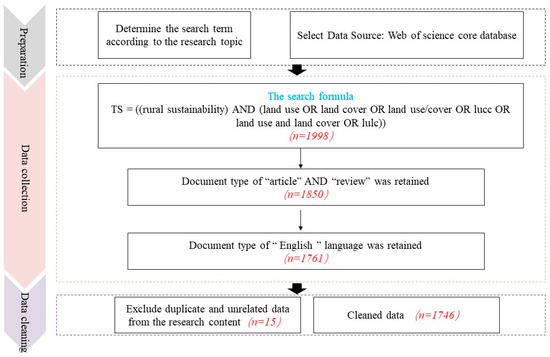 In order to amass literature related to rural sustainability and land use, a comprehensive search was conducted in the subject fields, including title, abstract, author keywords, and keywords plus. After iterative experiments and consultations with field experts, the following search formula was established: TS = ((rural sustainability) AND (land use OR land cover OR land use/cover OR lucc OR land use and land cover OR lulc)). The data retrieval was performed in June 2023. To ensure the quality of the articles, several restrictions were applied within the Web of Science database. The language was limited to English, and the document types were restricted to “article” and “review articles”, excluding book chapters, editorial materials, and others. The search period spanned from 1990 to 2023, as articles published before 1990 were not available in the database. The search results were exported as complete records in a “.txt” format, including DOI, authors, title, publication year and month, journal, author contact information, abstract, and references. Manual screening using Bibliometrix was then conducted based on titles and abstracts to remove duplicates and irrelevant data. After this screening process, a final selection of 1746 publications that met the inclusion criteria was obtained. The entire process of data collection and cleansing is summarized in Figure 3.