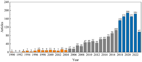 Number of articles published by relevant institutions in the field of rural sustainability and land use from 1990 to 2023.