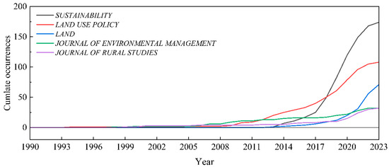 A trend analysis of the top five journals in terms of the number of publications (Figure 5) shows that Land Use Policy has the longest publication history, with its first article published as early as 1994. Sustainability, although starting later, showed a rapid increase in publication volume over time. From 1990 to 2023, all five journals exhibited a steady growth trend in terms of the number of publications. As of June 2023, Sustainability had published 174 papers, Land Use Policy had published 108 papers, and Land had published 71 papers.