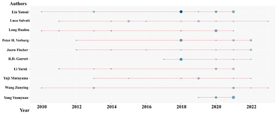 Based on their contribution and influence in this field, the top 10 most influential scholars are as follows: Liu Yansui, Luca Salvati, Long Hualou, Peter H. Verburg, Joern Fischer, R.D. Garrett, Li Yurui, Yuji Murayama, Wang Jianying, and Yang Yuanyuan (Figure 6). Liu Yansui, affiliated with the Institute of Geographic Sciences and Natural Resources Research, Chinese Academy of Sciences, has the highest number of publications with 12 papers. Three of his papers published in 2018 have received notable citations, indicating their impact on the field. Liu Yansui has been conducting long-term research on the relationship between rural sustainable development and land use and has actively participated in international conferences on “Land Use and Rural Sustainable Development.” His paper titled “Introduction to land use and rural sustainability in China” has made a significant academic impact. Luca Salvati has published 11 papers, while Long Hualou, Peter H. Verburg, and Joern Fischer have published 9, 9, and 8 papers, respectively. Notably, Long Hualou and Li Yurui have collaborated frequently, focusing on the transformation of rural areas in China and its impact on ecosystem services [7,57]. Peter H. Verburg primarily investigates the theoretical foundations of sustainable land use development [58], while Joern Fischer pays particular attention to the role of conservation policies and strategies in rural sustainable development [59].
