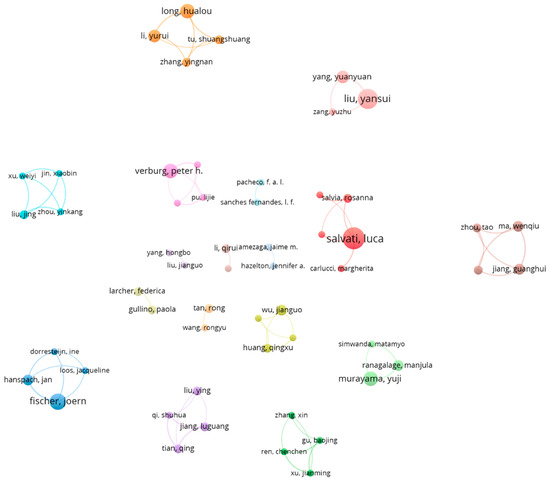Author collaboration network in the field of rural sustainability and land use. Note: The same color means that these authors are in the same network.
