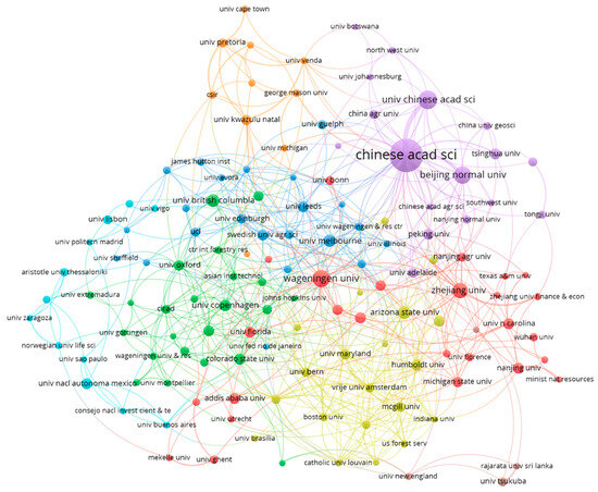 Institutional cooperation network in the field of rural sustainability and land use from 1990 to 2023. Note: The same color means that these institutions are in the same collaborative network.