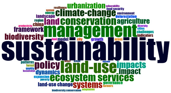 In the field of rural sustainability and land use, the top 50 high-frequency keywords provide valuable insights into the research hotspots (Figure 11). The top 10 keywords and their frequencies are as follows: sustainability (310), land use (81), agriculture (72), ecosystem services (72), China (69), rural development (64), food security (59), sustainable development (52), urbanization (46), and climate change (45). These keywords reflect the central themes and areas of interest within the field. Scholars are particularly focused on topics related to the sustainable development of rural areas, including the management and utilization of land resources, agricultural practices, and the provision of ecosystem services. The emphasis on China as a keyword highlights the significance of research conducted in the context of China’s rural development and its implications for global sustainability. Additionally, the keywords related to rural development, food security, sustainable development, urbanization, and climate change demonstrate the interdisciplinary nature of research in this field, encompassing social, economic, and environmental dimensions.