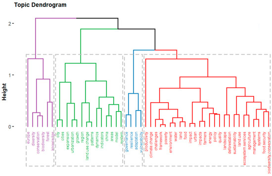 Hierarchical clustering analysis of high-frequency keywords in the field of rural sustainability and land use. Note: Different colors in the figure represent different clusters.