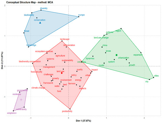 Multiple correspondence analysis of keywords in the field of rural sustainability and land use. Note: Different colors in the figure represent different clusters.
