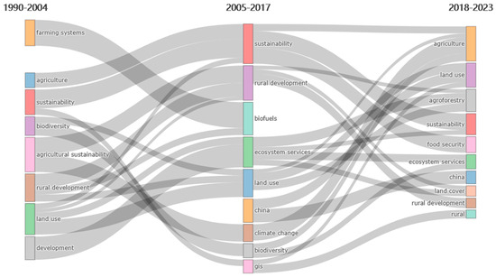 From 1990 to 2023, the number of papers issued in the field of rural sustainability and land use research generally showed a fluctuating upward trend (Figure 4). This study divided the relevant research into three phases based on the number of publications: 1990–2004, 2005–2017, and 2018–2023. The period from 1990 to 2004 can be characterized as the nascent development phase, with a low publication volume averaging below seven papers per year. Publications during these 15 years accounted for only 5.9% of the total. Scholars during this period primarily focused on assessing the agricultural landscape value to aid farmers and policymakers in better managing agricultural landscapes [52]. The period from 2005 to 2017 represented the expansion and promotion phase, with a noticeable increase in annual publication volume, averaging 52.3 papers per year. Research papers accounted for 38.95% of the total publications. The research during this period mainly focused on the impact of land use (including land use change and land management) on rural sustainable development [53,54,55]. The period from 2018 to the present marked the rapid development phase, with the research papers published during this period accounting for 55.15% of the total collected in this study. The number of papers published annually exceeded 170 from 2019 to 2022 alone. Research in this period focused on the analysis of the integration of “ecology-production-life” in the countryside [35,56] and the impact of policies on rural land use and sustainable development [29,33].