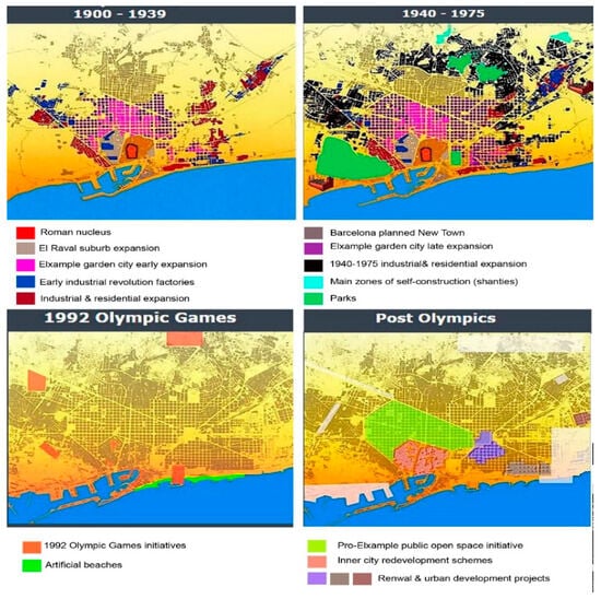 Barcelona’s modernization began with the preparations for the 1992 Olympics. Planners devised a comprehensive strategy and utilized the Games as a tool for city-wide improvements. The Olympic facilities were distributed throughout four neglected metropolitan districts. The Olympic Village, built on abandoned industrial property along the shore, was the most well-known feature of the time []. The most significant consequence has been the development of six artificial beaches on either side of the Olympic Port, and for the first time in its history, Barcelona faced the sea []. Figure 2 shows Barcelona’s urban growth from 1990 until the post Olympics period.