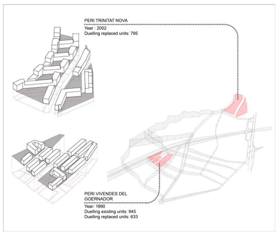 Participation of residents was considered throughout planning and execution. A set of conditions, such as minimal energy use, water recycling systems, and the utilization of renewable energies, were agreed upon by representatives from the neighbors and the government []. Figure 3 shows two urban renewal projects in Peri Trinitat Nova and Peri Vivendes Del located in Nou Barris district, which are designed to address specific needs and challenges within the Nou Barris district, contributing to its overall improvement and the well-being of its residents.