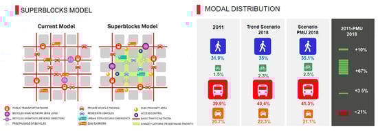 Superblocks model and modal distribution of (PMU) in Barcelona. Source: [].