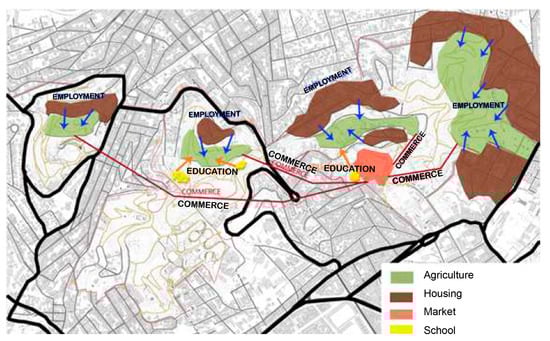 Urban agriculture policies, which have been considered since the first metropolitan master plan, have been instrumental in improving the availability of parks, particularly in residential areas. The strategy (sustainable tourism, leisure, employment, and trade) supports the idea of creating development corridors for the population, whether in terms of providing sustainable transportation that minimizes negative environmental impacts or of opportunities for sustainable urban development that considers the social, economic, and environmental impacts of urban growth; such opportunities might include the establishment of an urban farming system and pedestrian and bicycle paths, and the creation of an interconnection between green areas, urban agriculture, and residential areas. Figure 5 shows urban agriculture system proposed in the strategic planning for the Tres Turons hills