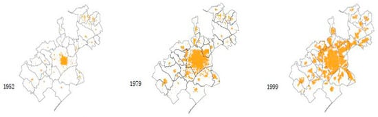 Urban expansion in Montpellier between 1952–1999. Source: [].