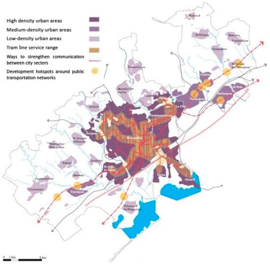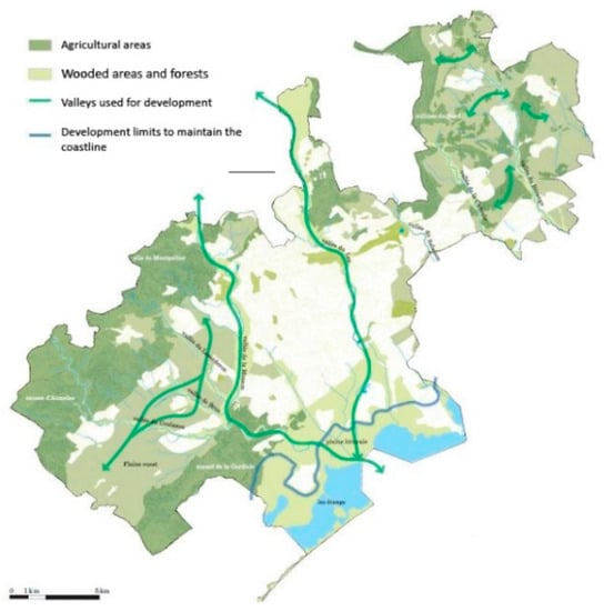 - Buyck, J.; Chéry, J.-P.; Jarrige, F. Analysis of Regional Spatial Planning and Decision-Making Strategies and Their Impact on Land Use in the Urban Fringe; Montpellier Case Study; [Contract] 036921; Module 3; D3.3.2; ffhal-02823027f; HAL Open Science: Lyon, France, 2008; Available online: https://hal.inrae.fr/hal-02823027/document (accessed on 19 August 2023).