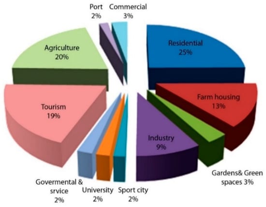 In recent years, Latakia city has seen significant climatic changes, including changes in precipitation rates, an increase in average temperatures, a drop in groundwater levels, and other significant climatic shifts that have had an effect on the ecosystem [,,]. The land use scheme that was suggested in the master plan did not give priority to expanding the effectiveness of the green network in the city, which plays an important role in responding to the effects of climate change. Instead, it made bigger areas available for residential and tourism-related purposes, some of which spread over large parts of the beach. In addition to this, it decreased the amount of land used for agriculture, which is regarded to be a fundamental component of the city’s local economy. Figure 21 shows the land use proposed in Latakia master plan 2008.