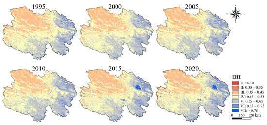 The EHI value showed a downward trend during 1995–2000 and 2005–2010, with a large decline of 6.43% in 1995–2000 and a slight decline of 1.66% in 2005–2010. In the rest of the study period, the EHI values showed a trend of growth, and the growth rate was the largest between 2000 and 2005, reaching 4.60%, followed by 2015–2020, with the growth rate at 4.28%. The growth rate from 2010 to 2015 was relatively small at 2.92% (Table 4).