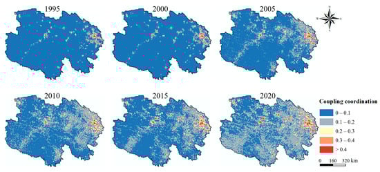 Spatial distribution of urbanization level in Qinghai from 1995 to 2020.
