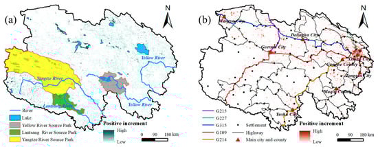 (a) Positive incremental changes in ecosystem health from 1995 to 2020; (b) positive incremental changes in urbanization from 1995 to 2020.