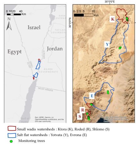 The study focuses on five sites in the southern Arava Rift Valley. The sites represent two different ecosystems and hydrological regimes: wadis of small catchments (Shlomo, Roded, and Ktora), and the margins of salt flats (Evrona Sabkha, Yotvata Sabkha) (Figure 1).