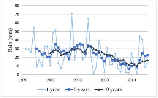 The percentage of dead trees at a site was a cumulative variable that included all standing dead trees (see Section 3.1.1. Identification of Dead Trees). Therefore, it is expected that this variable will correlate weakly with the last rainy season but will correlate better over a longer time span. In addition, the mortality process of a tree is long, usually more than one year []. Hence, we can expect the annual mortality to reflect the water supply of the past several years rather than only of the previous year. The recruitment rates on the other side of the population dynamics balance also depended on rainfall of more than one year. Low recruitment was usually due to unsuccessful tree establishment rather than insufficient germination. The deviation from the trend line of the mortality percentage, between 2012–2016 at the small wadi sites (Figure 7: red circles), was mainly an outcome of very low recruitment rates even after the rainfall trend shifted after 2010 (Figure 2). Thus, additional years of long-term monitoring records are essential for determining how long and how much rain is needed for population turnover and recovery.