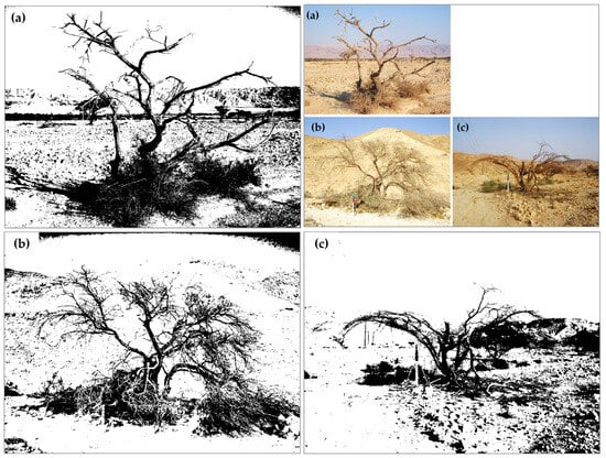 Black and white images of selected A. raddiana wood skeletons in Wadi Ktora in different stages of decomposition. Right-top: The original RGB images: (a) Year of death is unknown; >10 years. (b) Dead tree eight years after death. (c) Dead tree one year after death. The wood skeleton of a tree, one year after dying (Figure 4c), has fewer branches and appears to be in an advanced stage of decomposition compared to the wood skeleton of a tree that died seven years earlier (Figure 4b).
