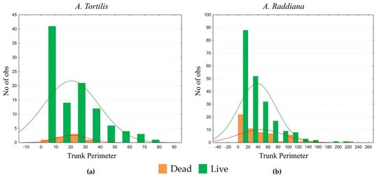 Size-frequency trunk perimeter (cm) distribution of dead and live trees: (a) A. tortilis; (b) A. raddiana.