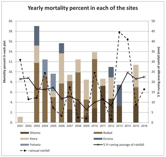This study included two types of mortality estimations: the percentage of dead trees from the entire population at the site each year (2000–2016) and the absolute number of trees that died each year during the monitoring years (2001–2016). The first estimate is a snapshot measure, but the second can be used to infer mortality rates. Because dead acacias remain standing after dying, the tree mortality percentage represents the accumulative mortality of an unknown number of years. Nevertheless, most studies on acacia population dynamics use this parameter to estimate tree mortality. The yearly temporal resolution of this study enables the unique database of the annual mortality rates of acacia trees in the southern Arava.