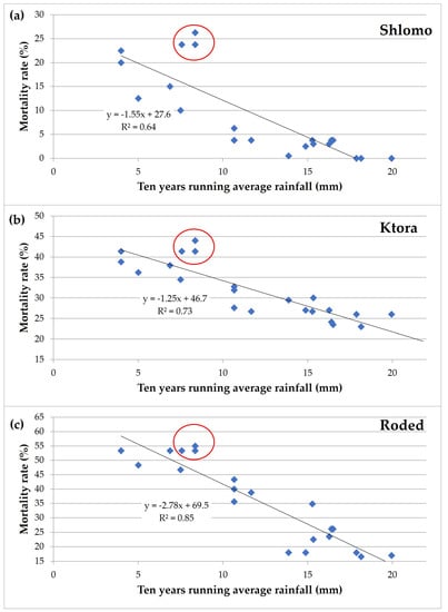 Linear regression of 10-year running average rainfall and mortality percentage in three sites: (a) Shlomo (r = −0.8; p = 0.0001), (b) Ktora (r = −0.85; p = 0.0001), (c) Roded (r = −0.92; p = 0.000). Modified by Peled [] (1981–1987) and this study (2000–2016). The dots in the red circle represent the years 2013–2016.