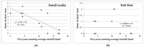 Linear regression of five-year running average rainfall and the sum of yearly dead trees at (a) small wadi sites: Shlomo, Roded, Ktora (r = −0.78; p = 0.000) and (b) margins of salt flat sites: Yotvata and Evrona (r = 0.000; p > 0.05).