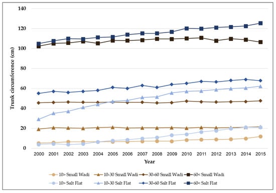 Mean trunk circumference of A. raddiana trees, grouped by size, for the years 2000–2015 in two sites: Wadi Ktora (small wadi) and Yotvata (salt flat), representing different hydrological regimes.