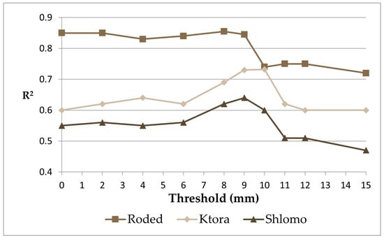 At all sites, the strongest correlation was found to be with a rainfall threshold of 8–10 mm. Months with lesser rainfall were excluded from the total annual rainfall. (Figure 10). The correlation was strongest in the Roded site and did not change much with or without any threshold up to 9 mm. For Shlomo and Ktora, the highest correlations were found to be with thresholds of 9 and 10 mm, respectively. Those results may suggest that rain events lower than 8 mm did not increase acacia trees survival rates. Differences in the effective rainfall (threshold found) between sites might have resulted from the variance between drainage basins’ attributes. However, variations of the effective rain among the three sites were not significant (1–2 mm).