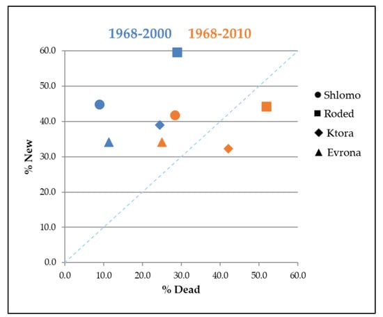Despite a high mortality percentage at most sites (Figure 6), no clear evidence of population decline was revealed when the monitoring time scale was extended using historical satellite images (Figure 11). Comparing regeneration and mortality rates from 1968 and 2000, the number of new trees exceeded dead trees at all the sites. However, considering the sequence of drought years that ended in 2010, an additional period was assessed: from 1968 to 2010. The results imply that between 2000 and 2010, tree populations at all sites experienced less renewal and more death than in the preceding decades. Two sites, Roded and Ktora, suffered a turnover of the regeneration–mortality ratio, i.e., total population decline. However, this period of high mortality may be episodic and not indicate a constant trend.