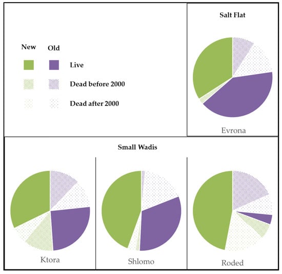 The Ktora and Roded plots had the highest mortality ratio: 42 and 49%, respectively (Figure 11); furthermore, the portion of new versus old dead trees in those plots was considerably higher compared to those of Shlomo and Evrona, where only few of the dead trees are new. The mortality of the Shlomo populations was evidently recent (Figure 12); 87% of the dead trees died after 2000. Likewise, the first record of a dead tree in this plot was from 2007, while the other plots ranged from 2001 to 2003 (Figure 6). In the Evrona and Shlomo populations, the vast majority of the dead trees were “old” (Figure 1), i.e., detected in the 1968 image. This may have implied that those populations were more stable and subject to a more moderate process of decline. Overall, each plot showed a unique pattern of mortality dynamics and no pattern was common to the small wadi plots versus the salt flats.