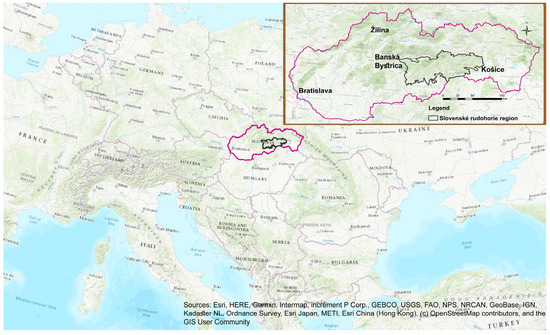 The monitored area (Slovenské rudohorie Mts.) lies in the center and southeast of Slovakia and covers an area of 4986 km2 (coordinates 48°45’ N 20°15’ E) (Figure 1). Geologically, it belongs to the Inner Western Carpathians subprovince and has a varied geological structure. Geomorphologically, it consists of eight geomorphological units, including the Veporské vrchy hills, Stolické vrchy hills, Revúcka vrchovina upland, Volovské vrchy hills and Čierna hora hill. They are characterized by a predominantly massive, often plateau relief. In the northwest lies the Spišsko-gemerský kras karst, and in the southeast lies the Slovenský kras karst. In the center of the region lies only one intermountain basin, the Rožňavská kotlina basin. Slovenské rudohorie Mts. received their name, Slovak Ore Mountains, from the past mining of a variety of ores there, particularly iron ore. At present, the mining of non-ore resources, such as magnesite and talc, continues here.