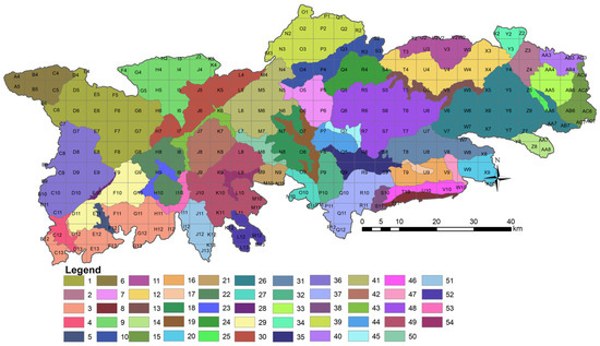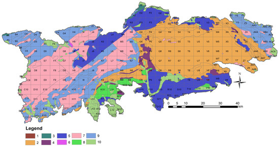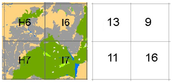 Example of soil type assessment in a 5 × 5 km grid. Each color represents a different soil unit. Square H6 contains six units, square H7 contains six units, square I6 contains seven units, and square I7 contains six units.