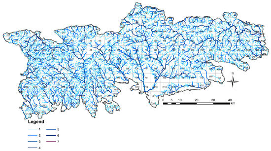 The river network of the Slovenské rudohorie Mts. Legend: 1—first tier flow, 2—second tier flow, 3—third tier flow, 4—fourth tier flow, 5—fifth tier flow, 6—sixth tier flow, 7—seventh tier flow.