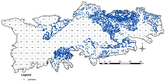 The type of aquifer (Figure 11), the density of the river network (Figure 12), and the presence of springs and mineral waters (Figure 13) are the three sub-indices that make up the hydrological diversity index [81]. The permeability of the rocks and the density of the river network directly influence the aquifer sub-index. When the permeability of the rocks is low, the amount of surface run-off can be significant (high value of the density river network sub-index), which results in the absence of aquifers (low value of the aquifer sub-index). Conversely, when the permeability of the rocks is high, surface run-off will be little, and there will be many aquifers. Finally, the sub-index on the presence of springs and mineral waters provides information on the plentiful aquifer supply. The aquifer type sub-index is represented as the number of units in each grid square. The length of watercourses separated into levels serves as the foundation for the river network density sub-index. The research area’s river network is separated into seven tiers on the base map [82]. The headwater streams represent the first tier, and confluence with other streams increases the tier for each confluence by one, until reaching tier seven. We classified the tiers into two categories based on length variability, with the first and second tier streams falling under category one, and the other (tiers three through seven) into category two. Streams within each category are divided into five degrees based on their length (Table 1). We gave each tier a coefficient of significance (CS) for the values in each square, with streams in tiers one and two receiving a CS of 0.25, tier three receiving a CS of 0.5, tier four receiving a CS of 1, tier five receiving a CS of 2, and tiers six and seven receiving a CS of 5. The river network density sub-index is then calculated as the sum of products of the degrees of flow lengths and CS.
