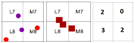 Example of the total mineral resource’s diversity squares L7, L8, M7, and M8. The squares contain their occurrence and score. Square L7 contains two occurrences, square L8 contains three occurrences, square M7 contains no occurrences, and square M8 contains two occurrences.